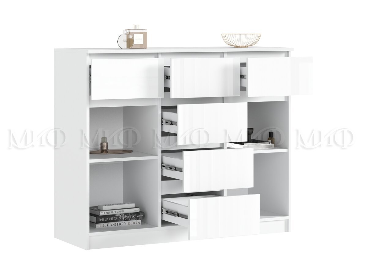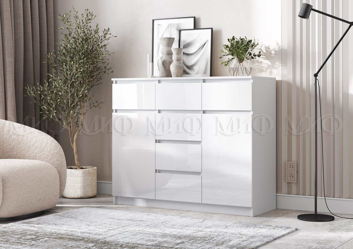 - Комод 1200 (2 двери 6 ящиков) Челси Белый Глянец, Белый