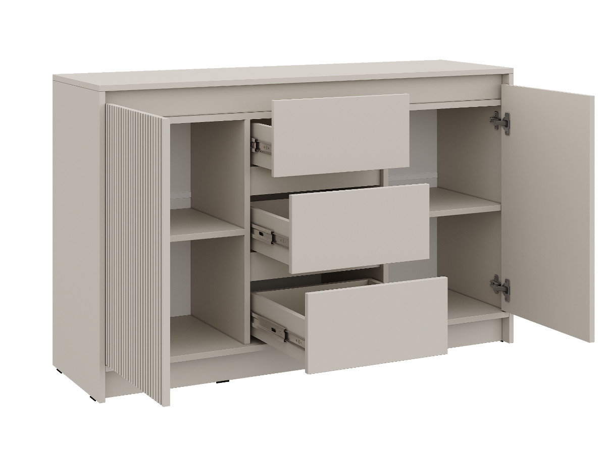 - Створки комода изготовлены из плиты МДФ 16мм и облицованы пленкой ПВХ. Для открывания створок предусмотрен зазор между фасадом и крышкой тумбы 30мм. Зазор закрыт изнутри планкой ЛДСП. За фасадами расположены полки съёмные, которые делят внутреннее пространство на 2 равные части Д.382 х В.282 х Г.358 мм.