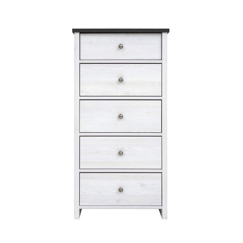 Комод содержит пять выдвижных ящиков на роликовых направляющих. Оборудован небольшими круглыми металлическими ручками серебристого цвета.