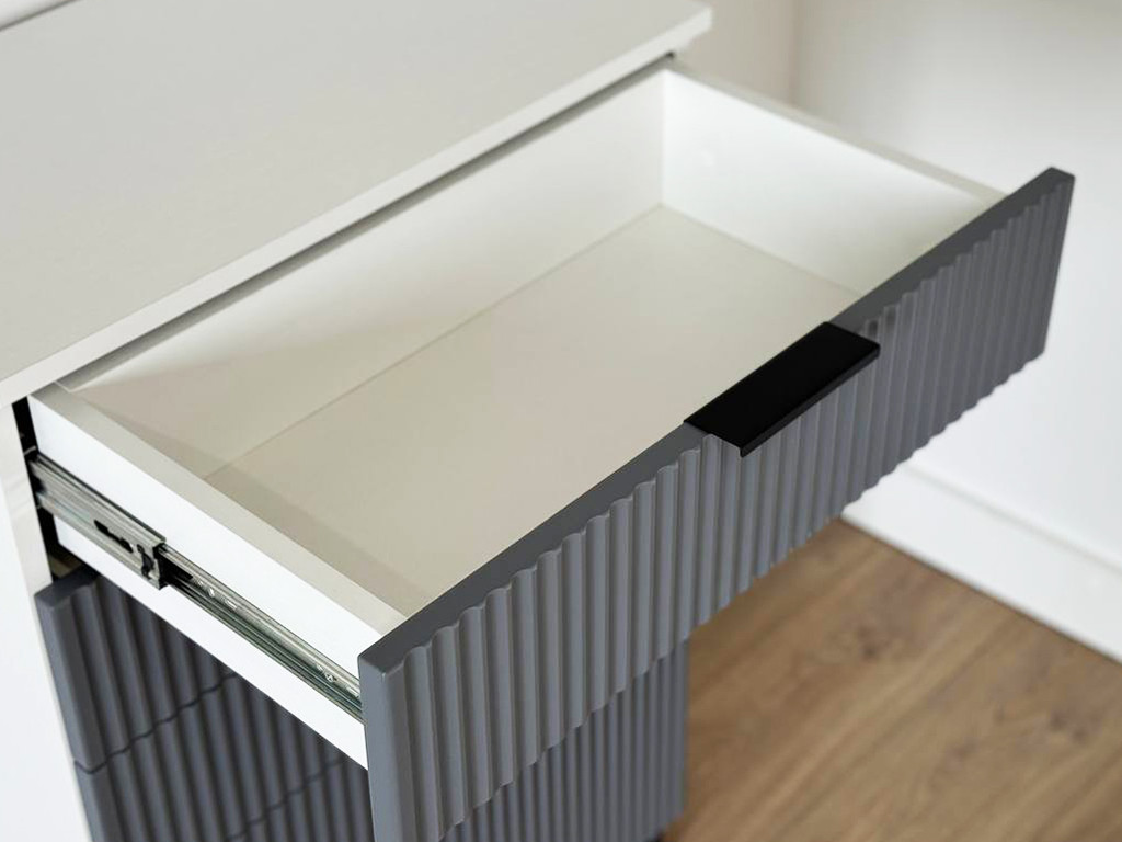 Комод «Зефир» — идеальное решение для детской и гостиной комнат. Он оснащён выкатными ящиками и откидной секцией, обеспечивая максимальный комфорт и удобство использования. Фасады украшены изящной фрезеровкой, которая придаёт изделию неповторимый шарм и элегантность.