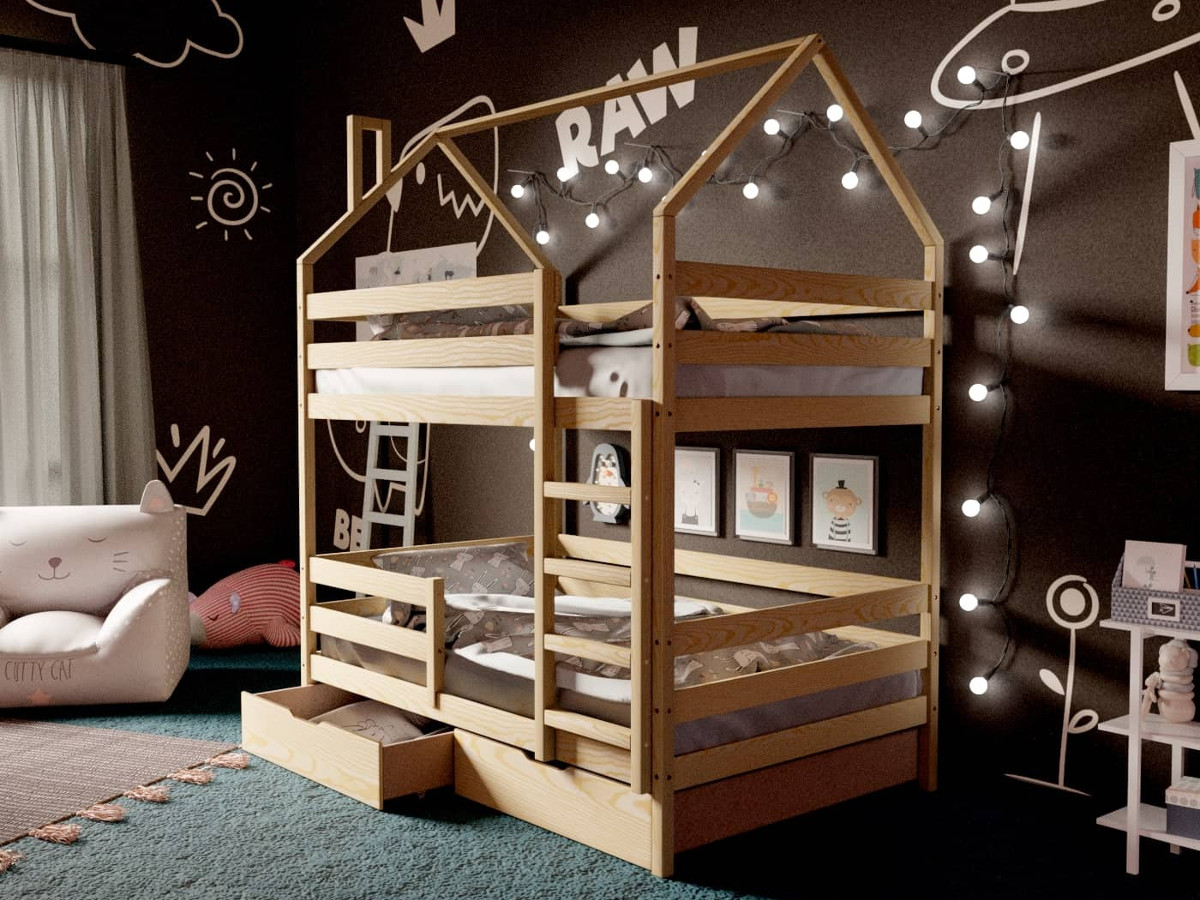 - Двухъярусная кровать-домик без покраски 80х190 см с ящиками