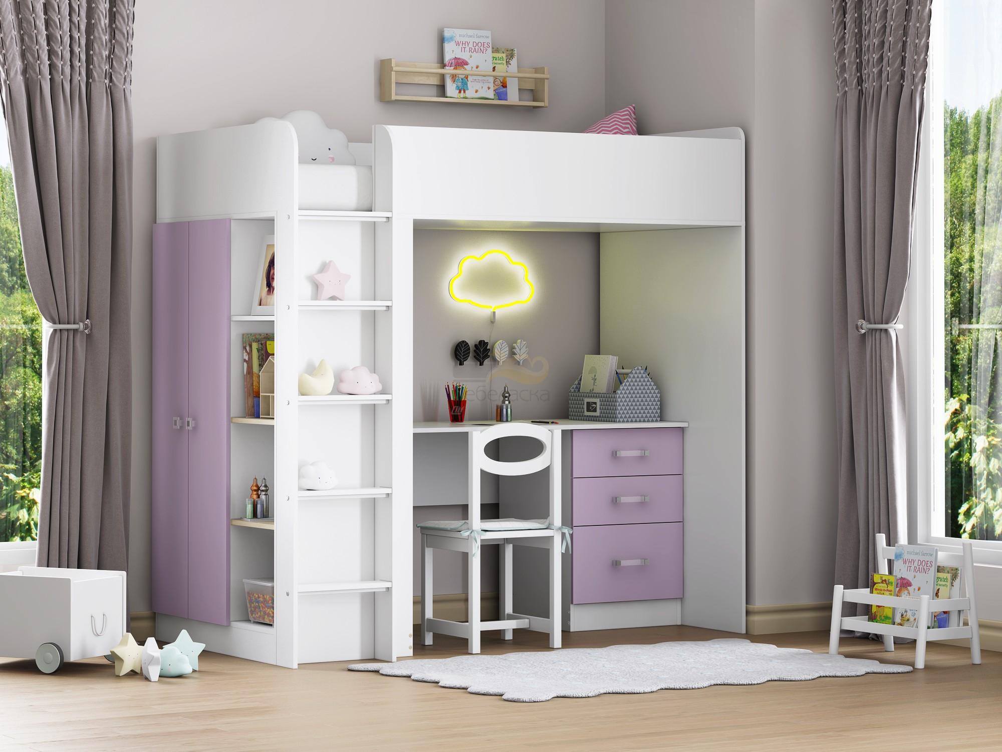 - Кровать чердак Теремок 3 Фиолетовый