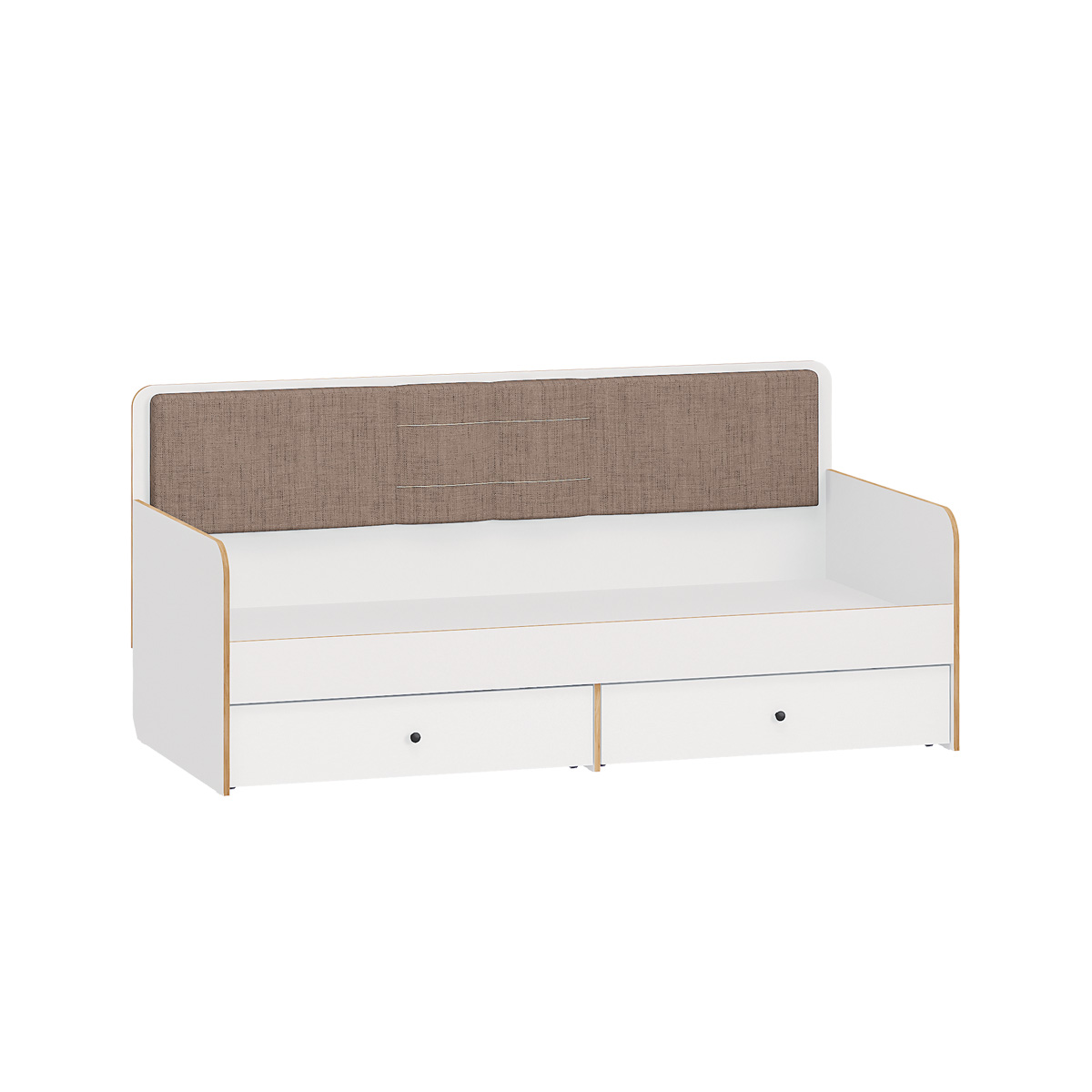 Мягкая накладка на изголовье обтянута рогожкой Саванна Латте, карманы отделаны экокожей Гранд Белый