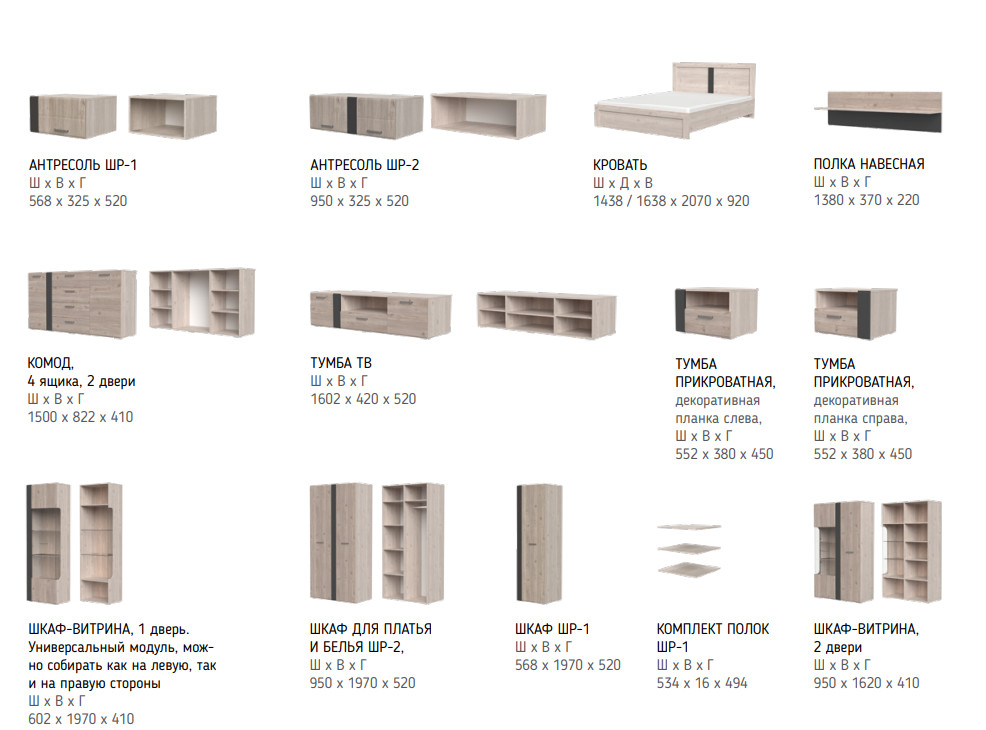 Цена за комплект: комод 4ящика+2двери, полка навесная, тумба ТВ, Шкаф с витриной 1дверь, Шкаф с витриной 2двери