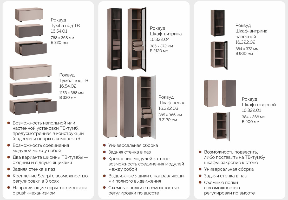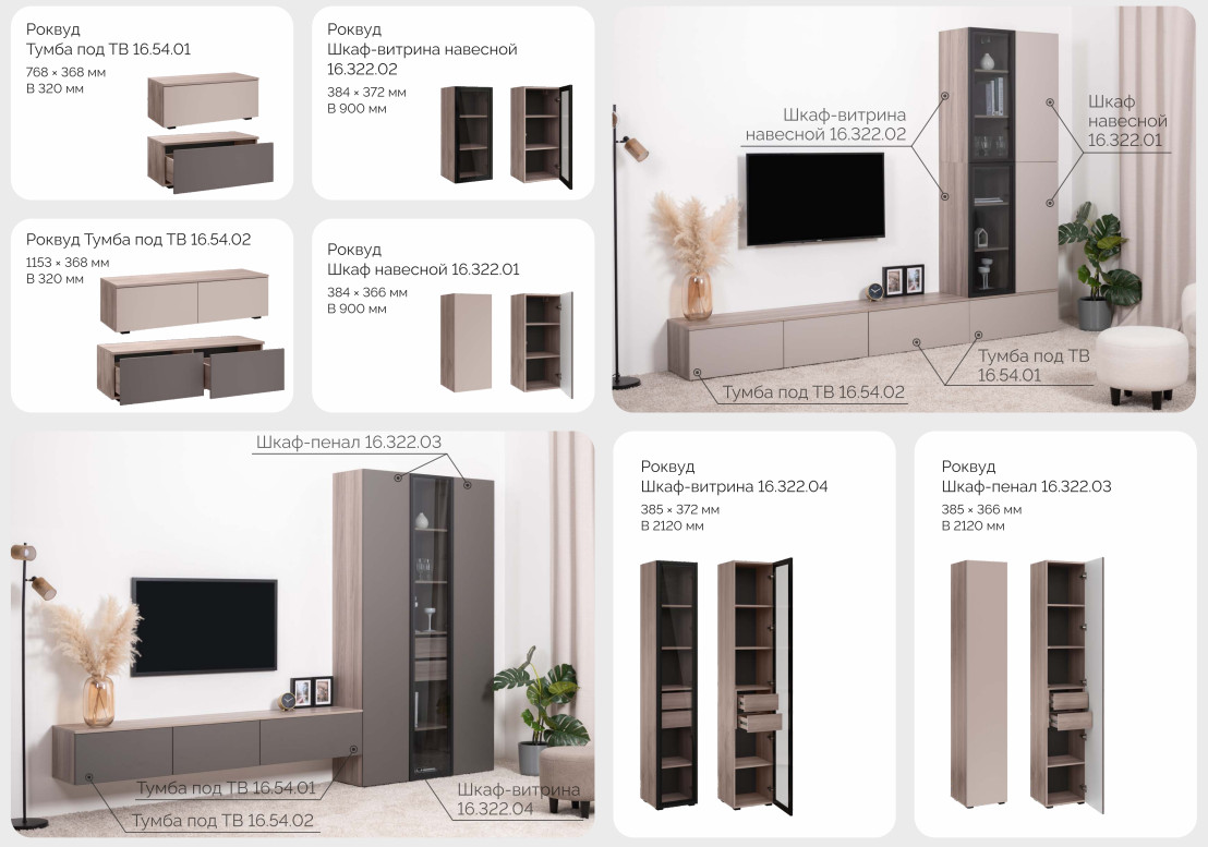 Цена за комплект: Тумба под ТВ 16.54.01 (2 шт), Тумба под ТВ 16.54.02, Шкаф навесной 16.322.01 (2 шт), Шкаф-витрина навесной 16.322.02(2 шт)