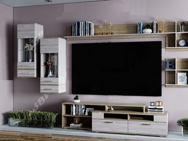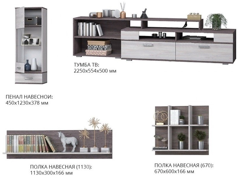 Гостиная состоит из: Пенала - 2 шт, полка 670 - 2 шт, полка 1130 - 2 шт и тумба ТВ