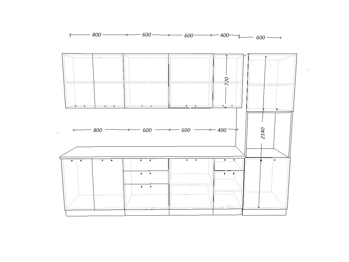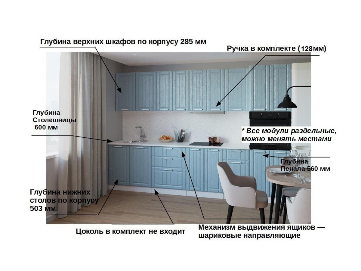Кухонная мойка, стеновая панель, посудосушитель, планки для столешницы в комплект не входят.