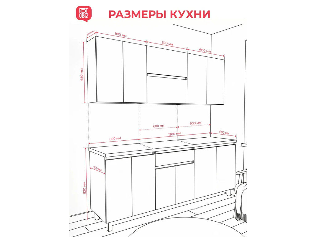 Высота нижних модулей с учетом столешницы и опор составляет 850 мм, глубина модулей - 500 мм.