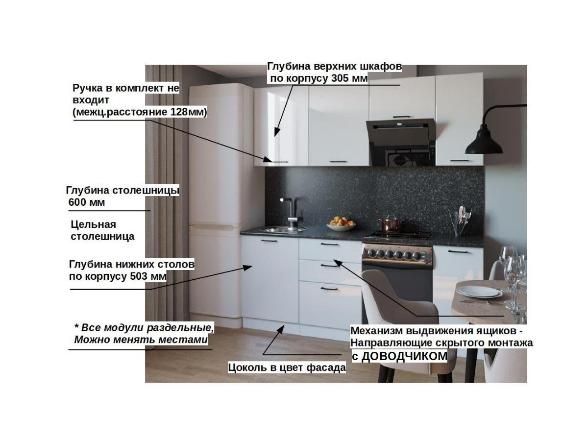 Кухонная мойка, стеновая панель, посудосушитель, планки для столешницы в комплект не входят.