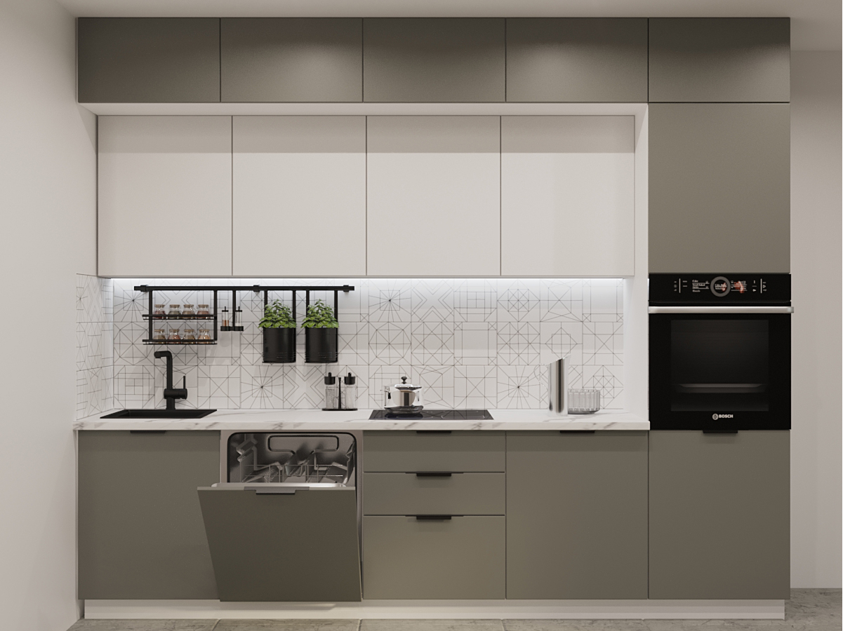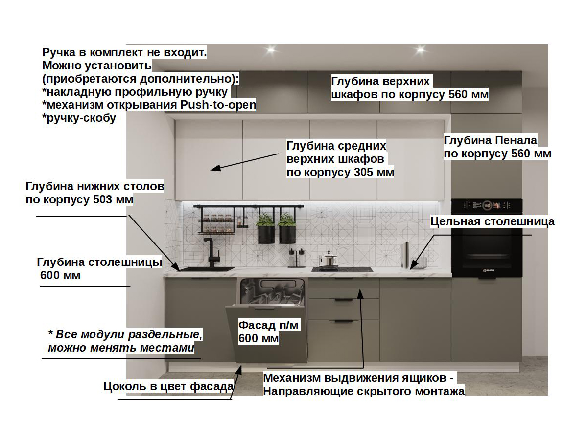 Кухонная мойка, стеновая панель, посудосушитель, планки для столешницы в комплект не входят.