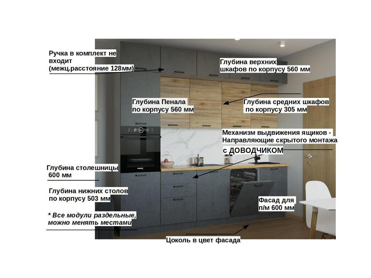 Кухонная мойка, стеновая панель, посудосушитель, планки для столешницы в комплект не входят.