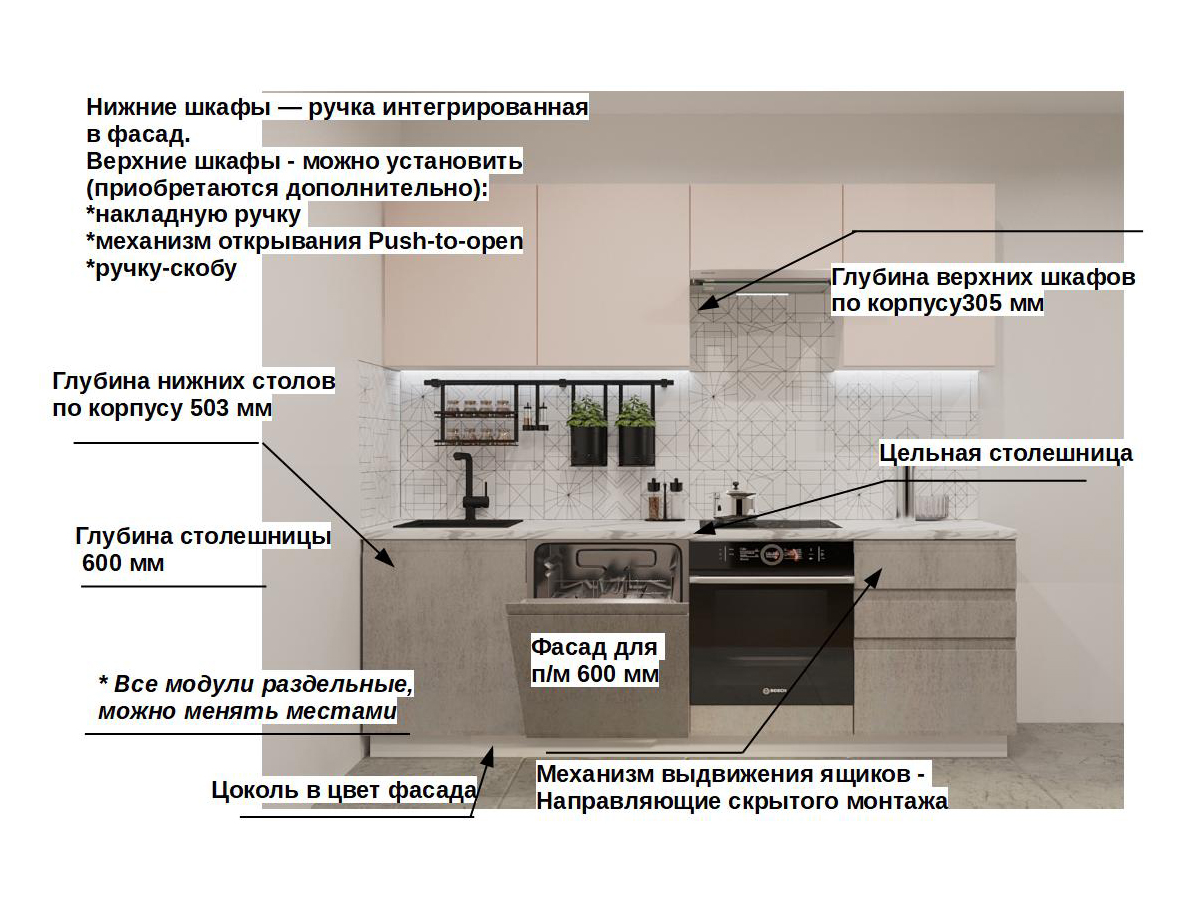 Кухонная мойка, стеновая панель, посудосушитель, планки для столешницы в комплект не входят.