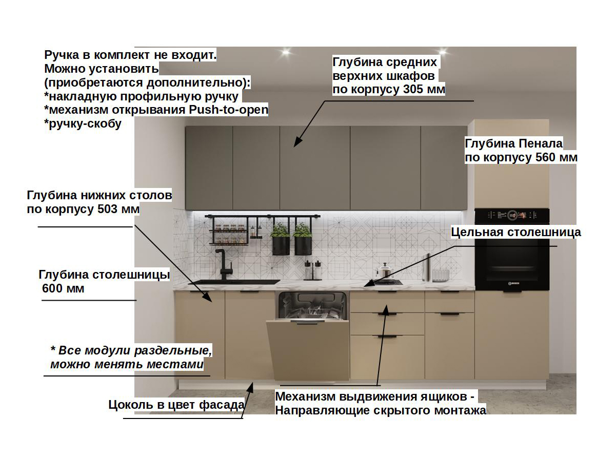 Кухонная мойка, стеновая панель, посудосушитель, планки для столешницы в комплект не входят.