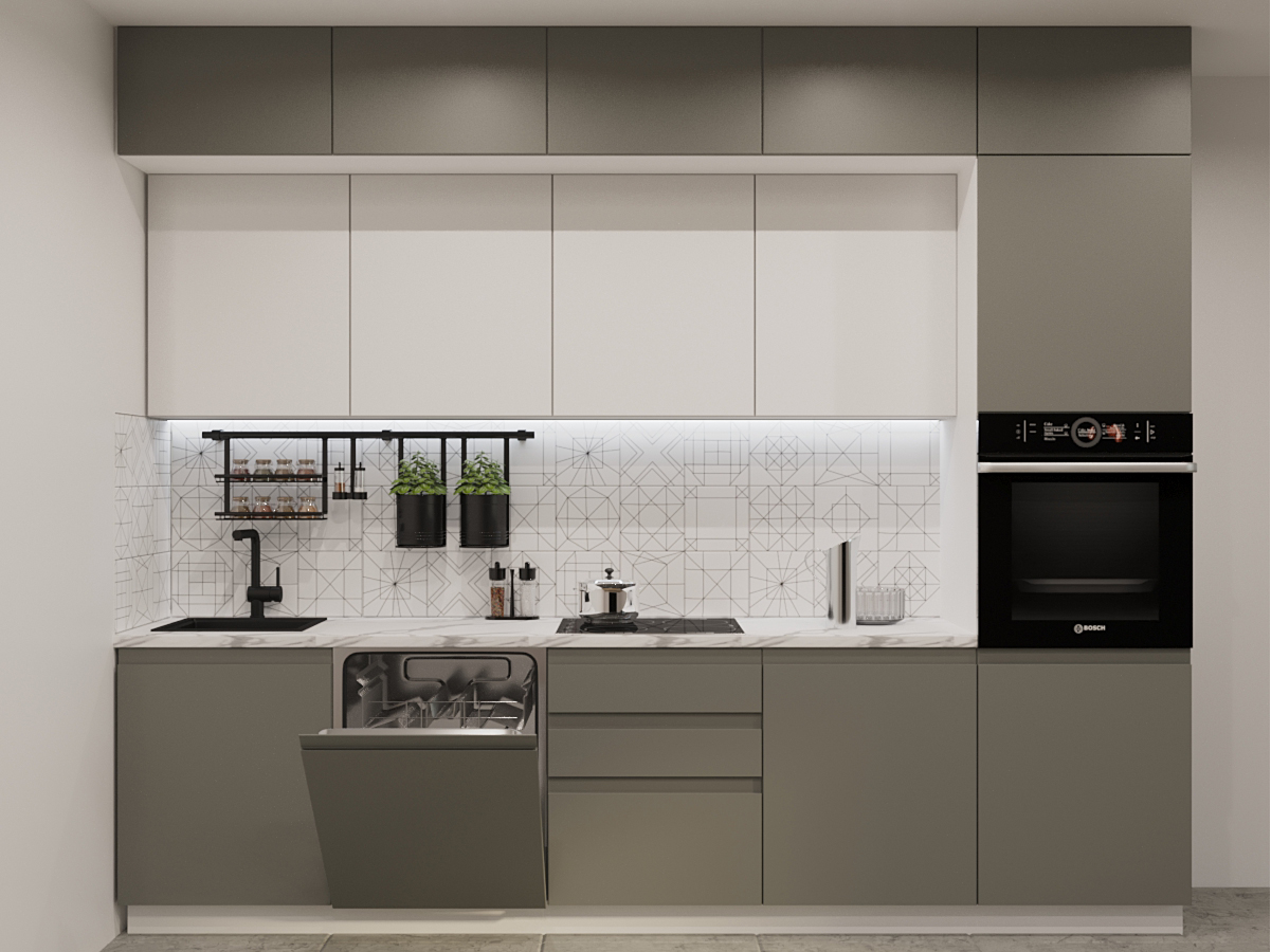 Кухонная мойка, стеновая панель, посудосушитель, планки для столешницы в комплект не входят.