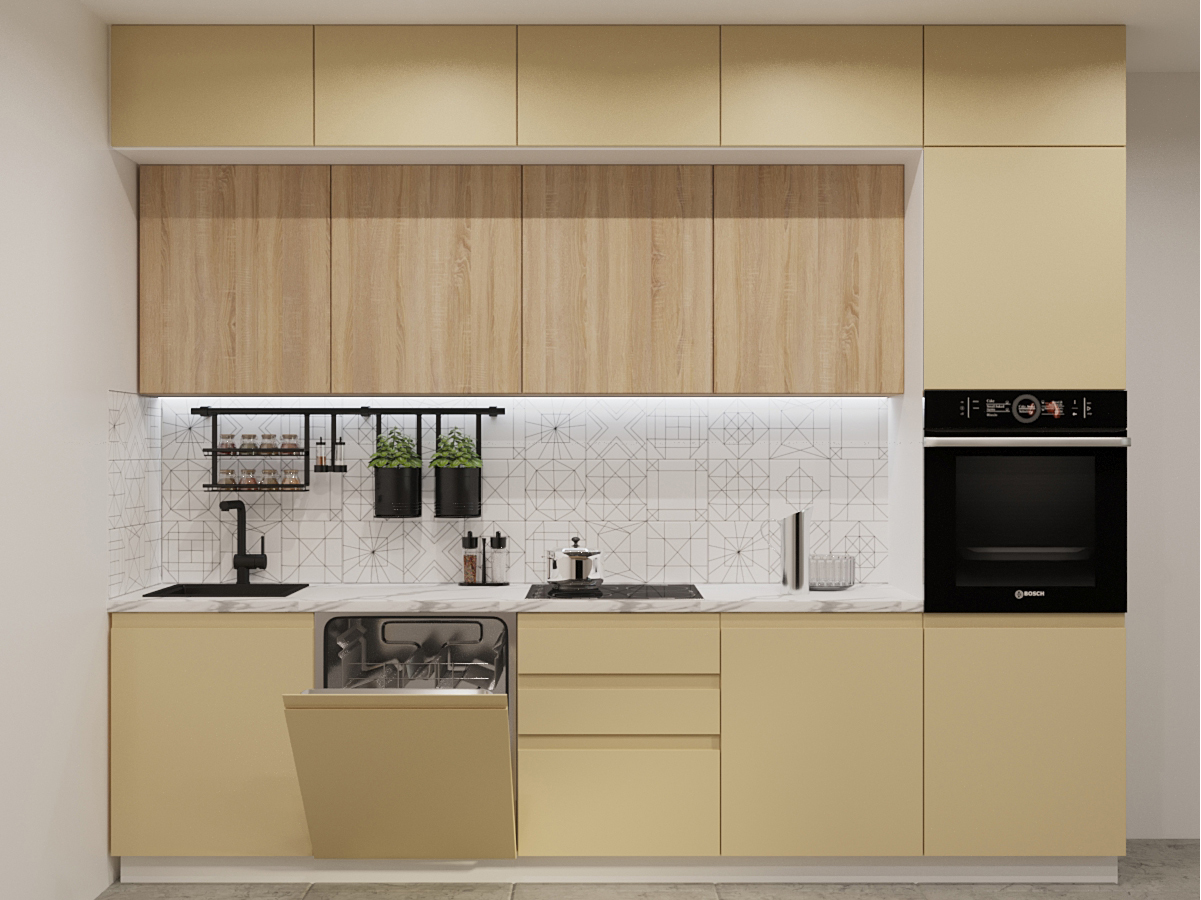 Кухонная мойка, стеновая панель, посудосушитель, планки для столешницы в комплект не входят.