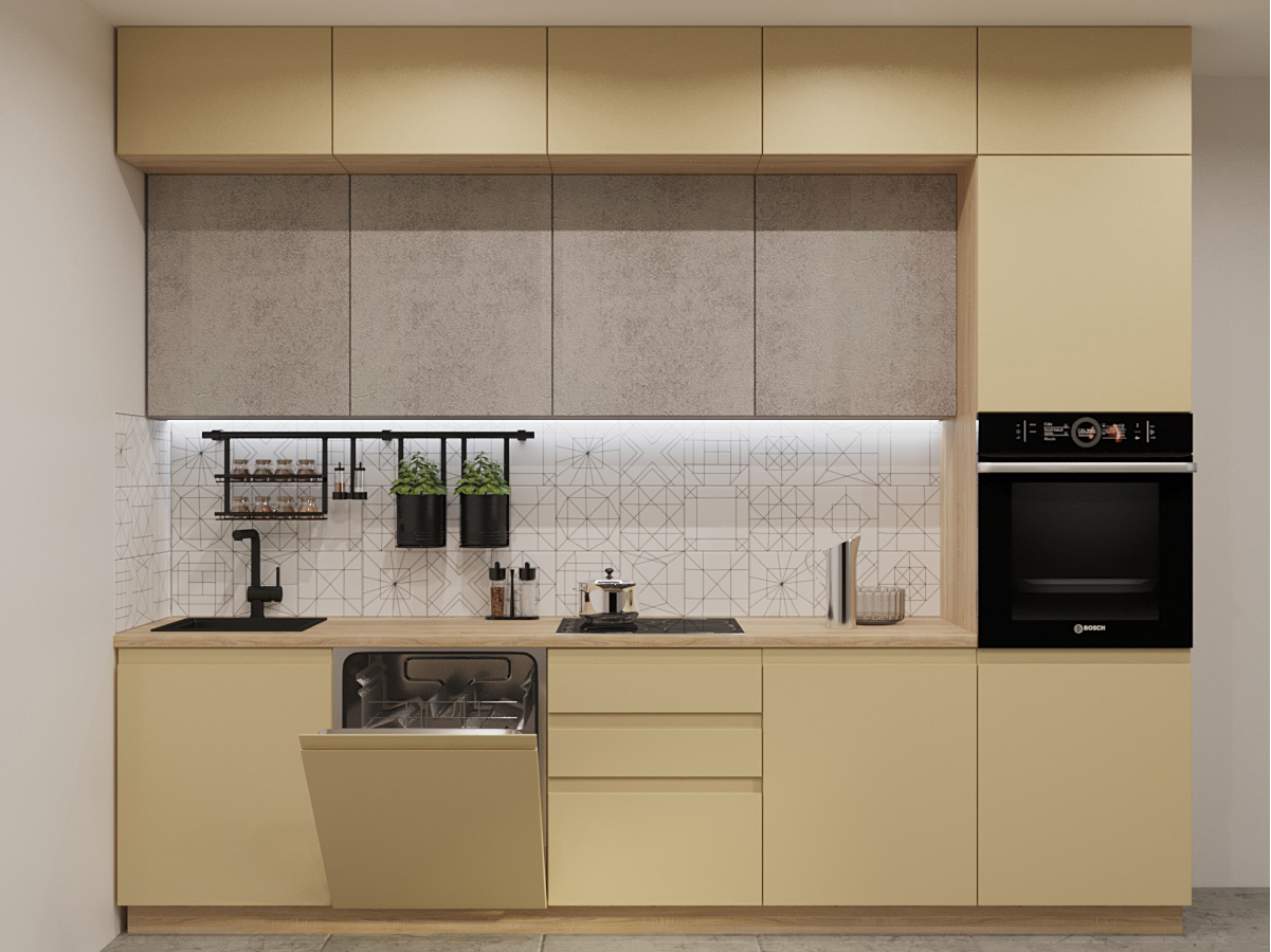 Кухонная мойка, стеновая панель, посудосушитель, планки для столешницы в комплект не входят.