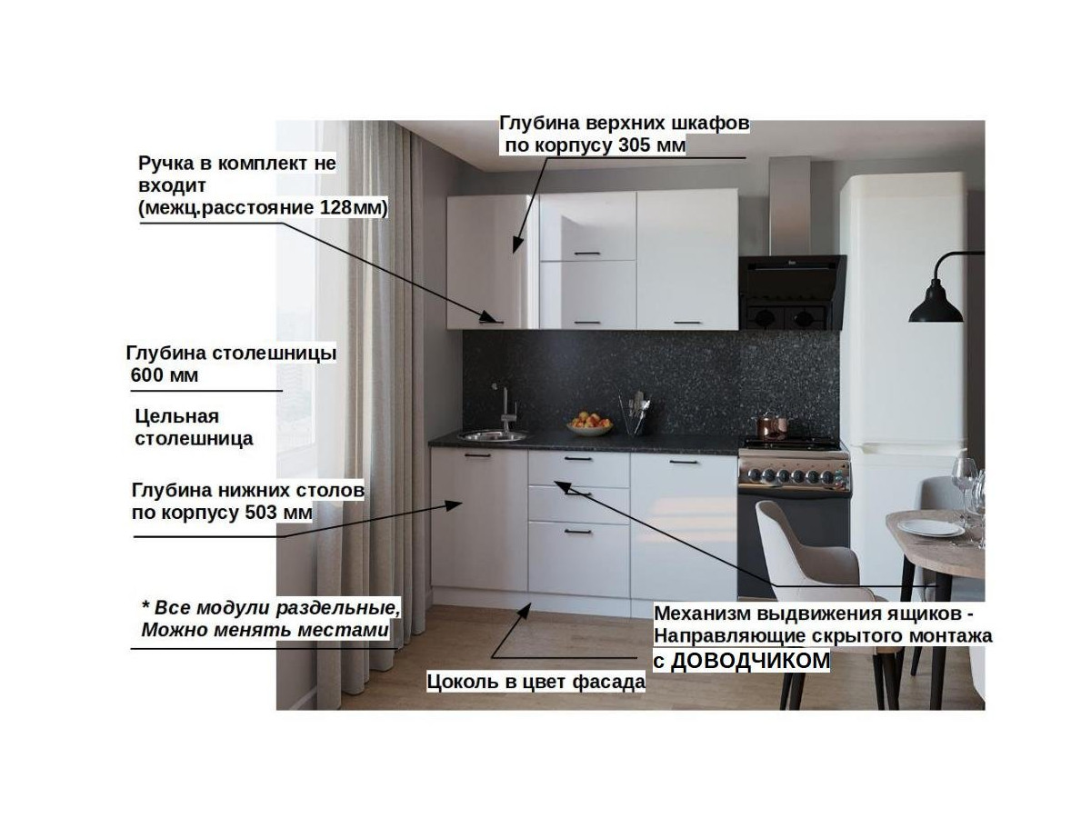 Кухонная мойка, стеновая панель, посудосушитель, планки для столешницы в комплект не входят.