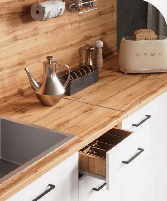 Столешница: Столешница 600+600мм+ модуль 600мм под накладную мойку, высота 26 мм, декор Белый Мрамор.