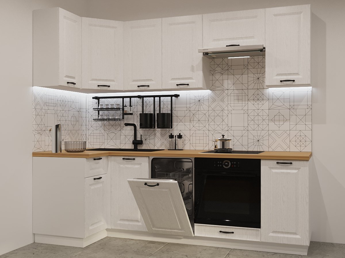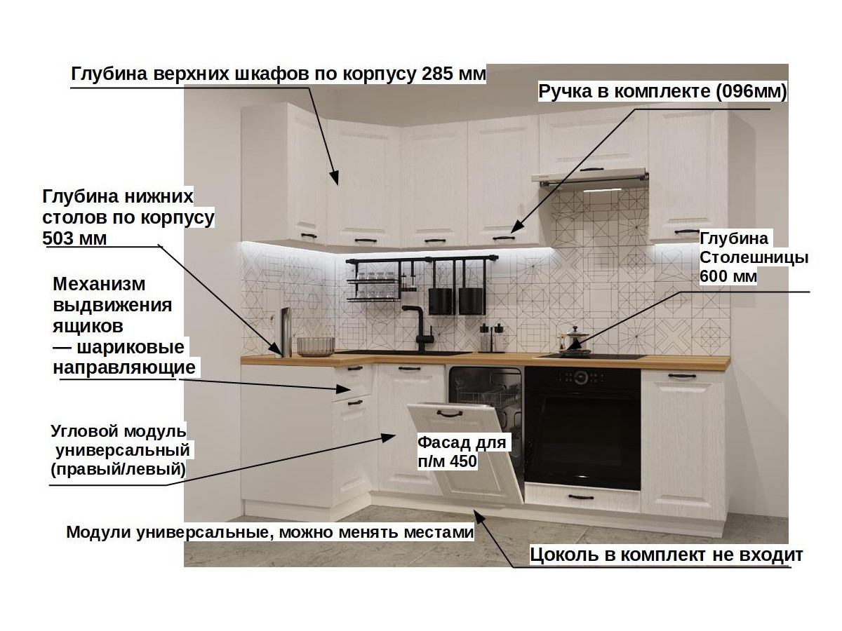 Кухонная мойка, стеновая панель, посудосушитель, планки для столешницы в комплект не входят.