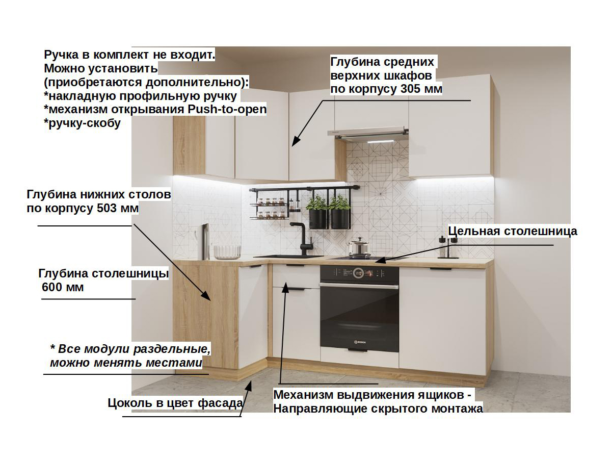 Кухонная мойка, стеновая панель, посудосушитель, планки для столешницы в комплект не входят.