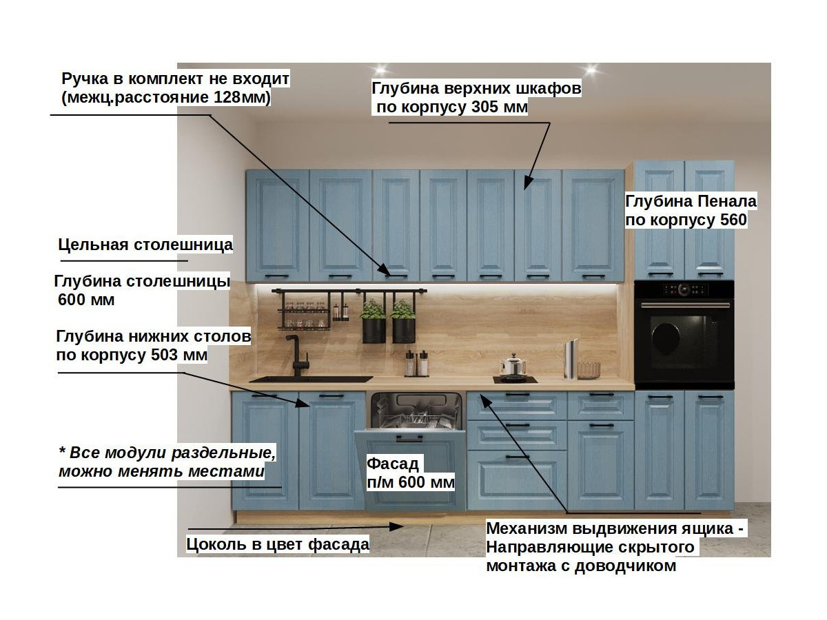 Кухонная мойка, стеновая панель, посудосушитель, планки для столешницы в комплект не входят.