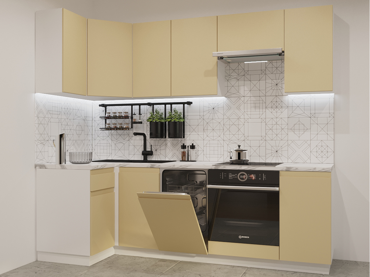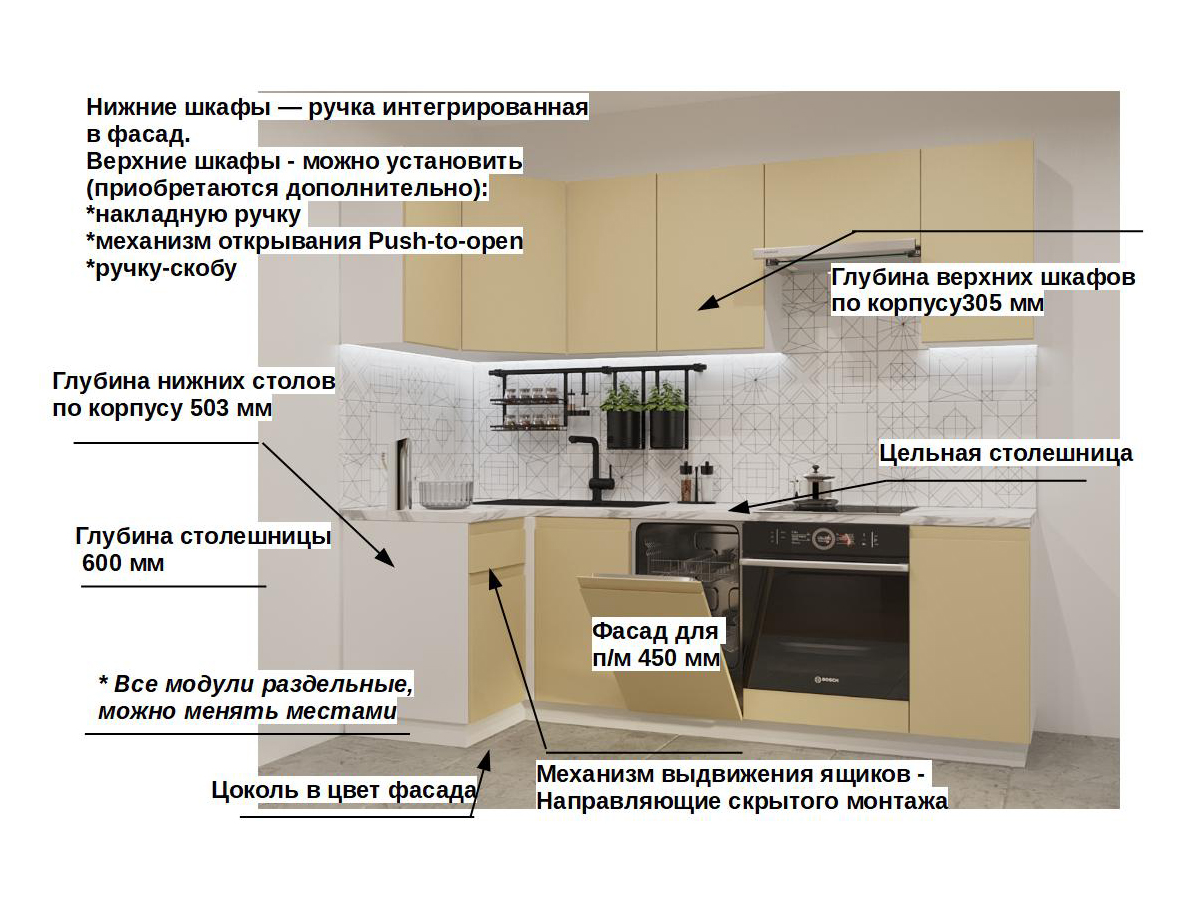 Кухонная мойка, стеновая панель, посудосушитель, планки для столешницы в комплект не входят.