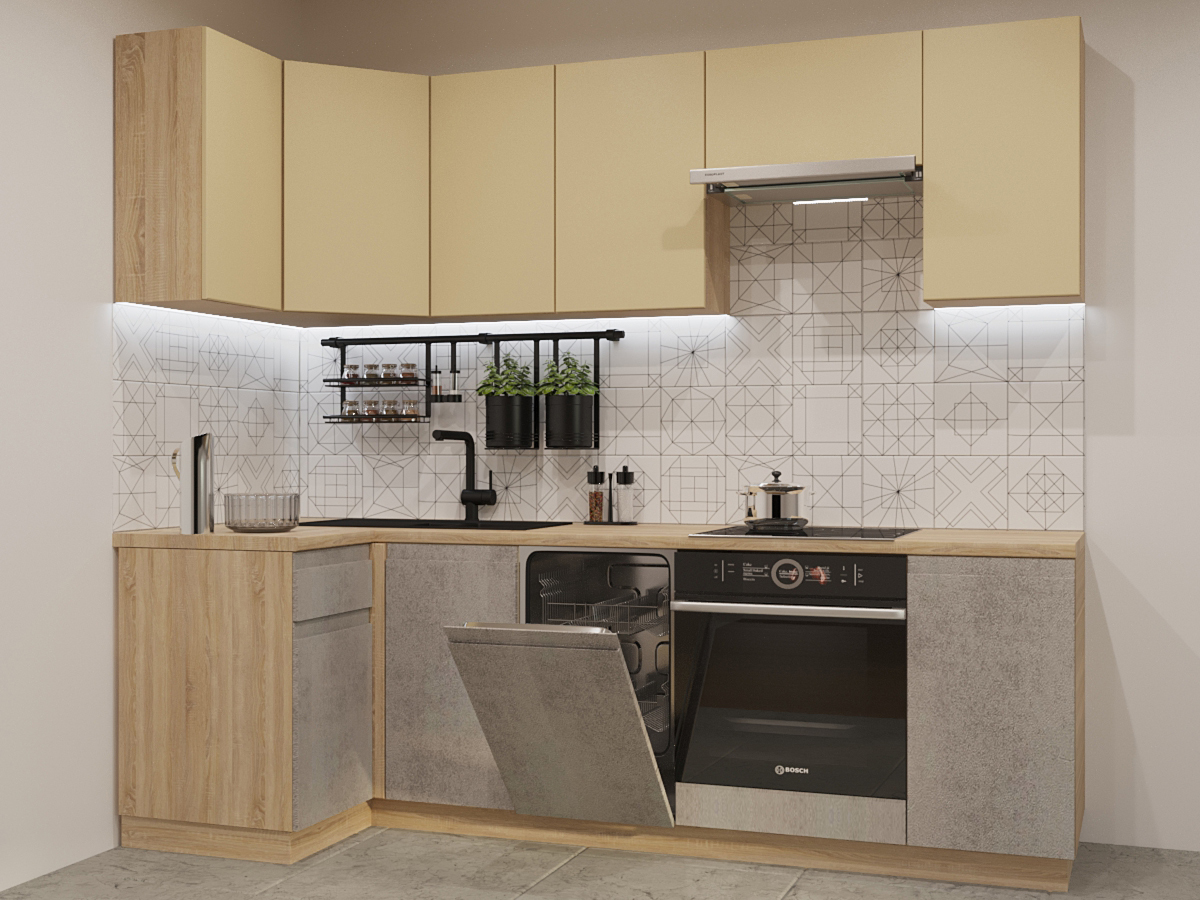 Кухонная мойка, стеновая панель, посудосушитель, планки для столешницы в комплект не входят.