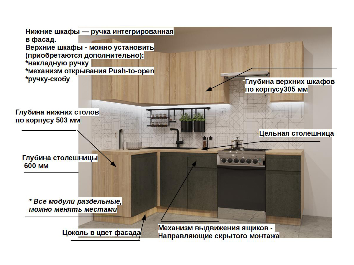 Кухонная мойка, стеновая панель, посудосушитель, планки для столешницы в комплект не входят.