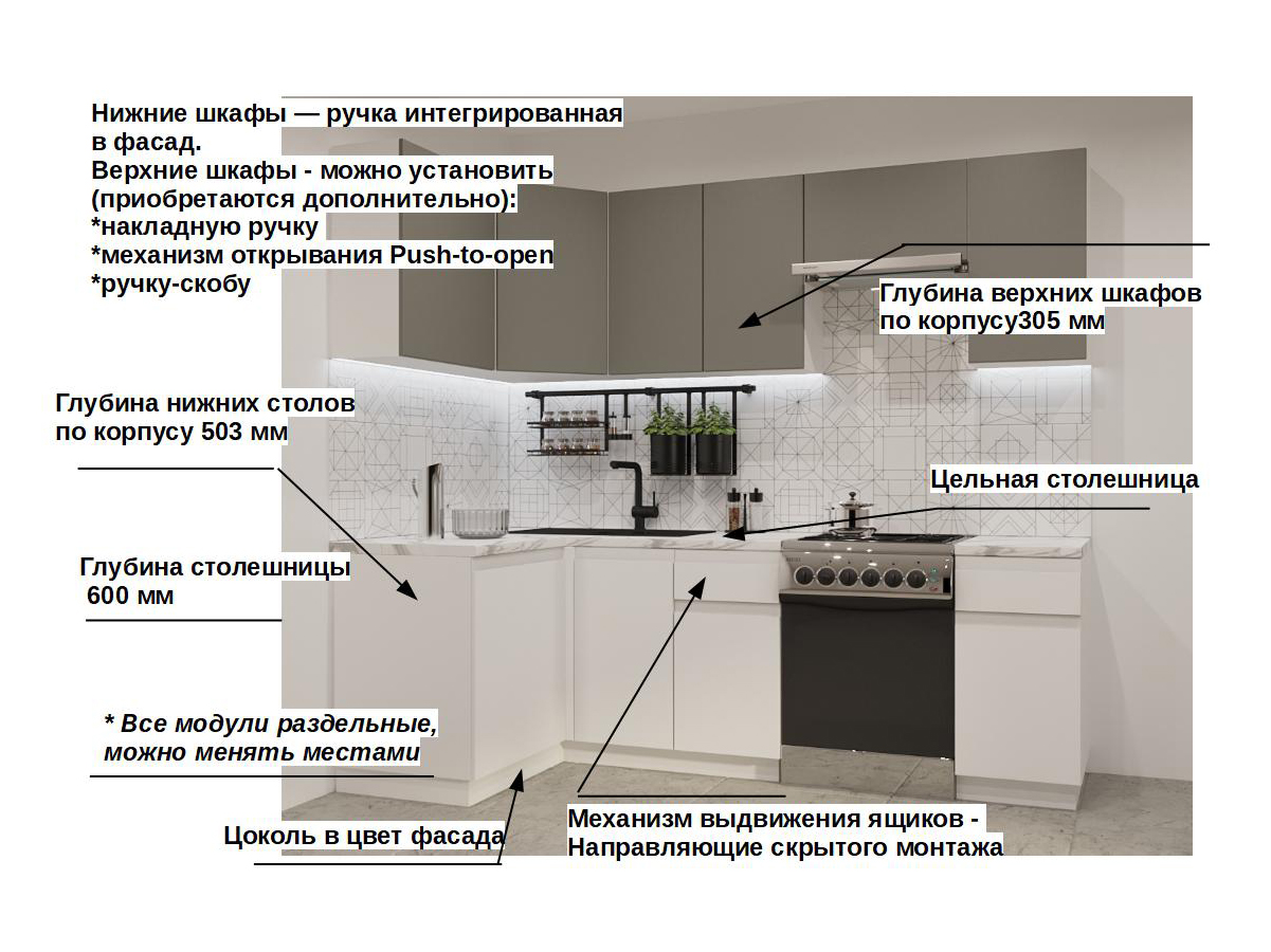 Кухонная мойка, стеновая панель, посудосушитель, планки для столешницы в комплект не входят.