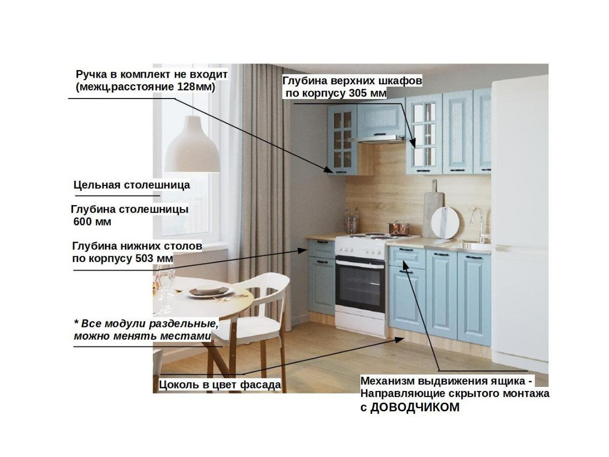 Кухонная мойка, стеновая панель, посудосушитель, планки для столешницы в комплект не входят.