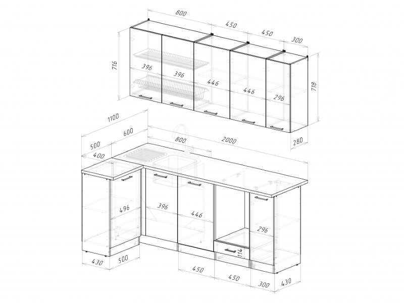 Мойка, смеситель, стеновая панель и посудосушитель в комплект гарнитура не входят.