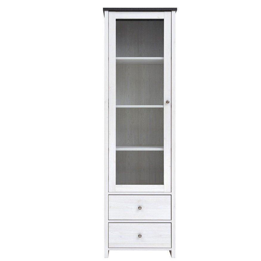 Витрина содержит два выдвижных ящика и одно закрытое отделение. За распашной дверью со вставкой из прозрачного закаленного стекла расположены три полки. Витрина оборудована небольшими круглыми металлическими ручками серебристого цвета. Используются петли Hettich и роликовые направляющие. Дверь может навешиваться как с правой стороны, так и с левой.