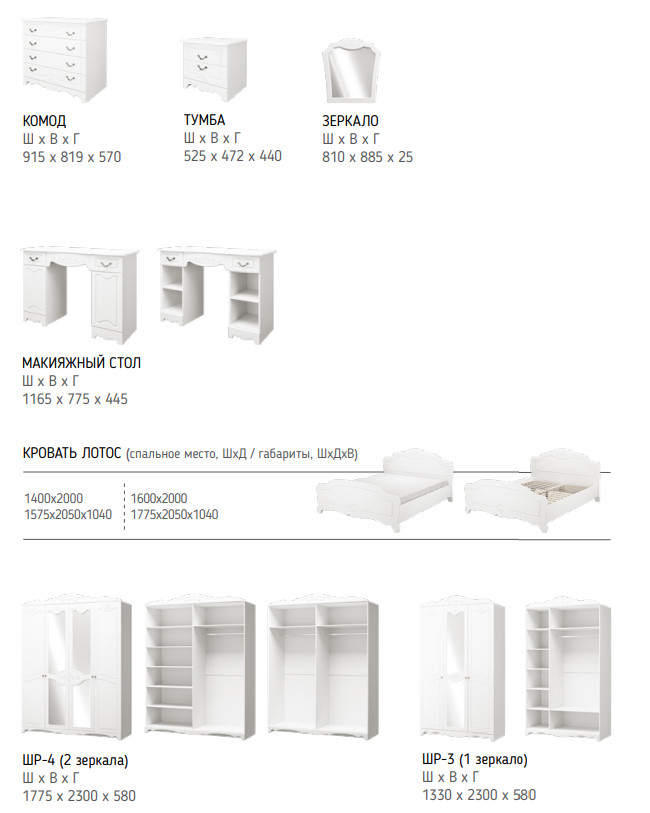 Цена за комплект: зеркало навесное, туалетный (макияжный) стол, комод 4 ящика, ШР-4 шкаф для платья и белья, тумба прикроватная (2 шт), кровать двойная 1400, опора с гибким основанием ЮР 48-03-1400 + ножки