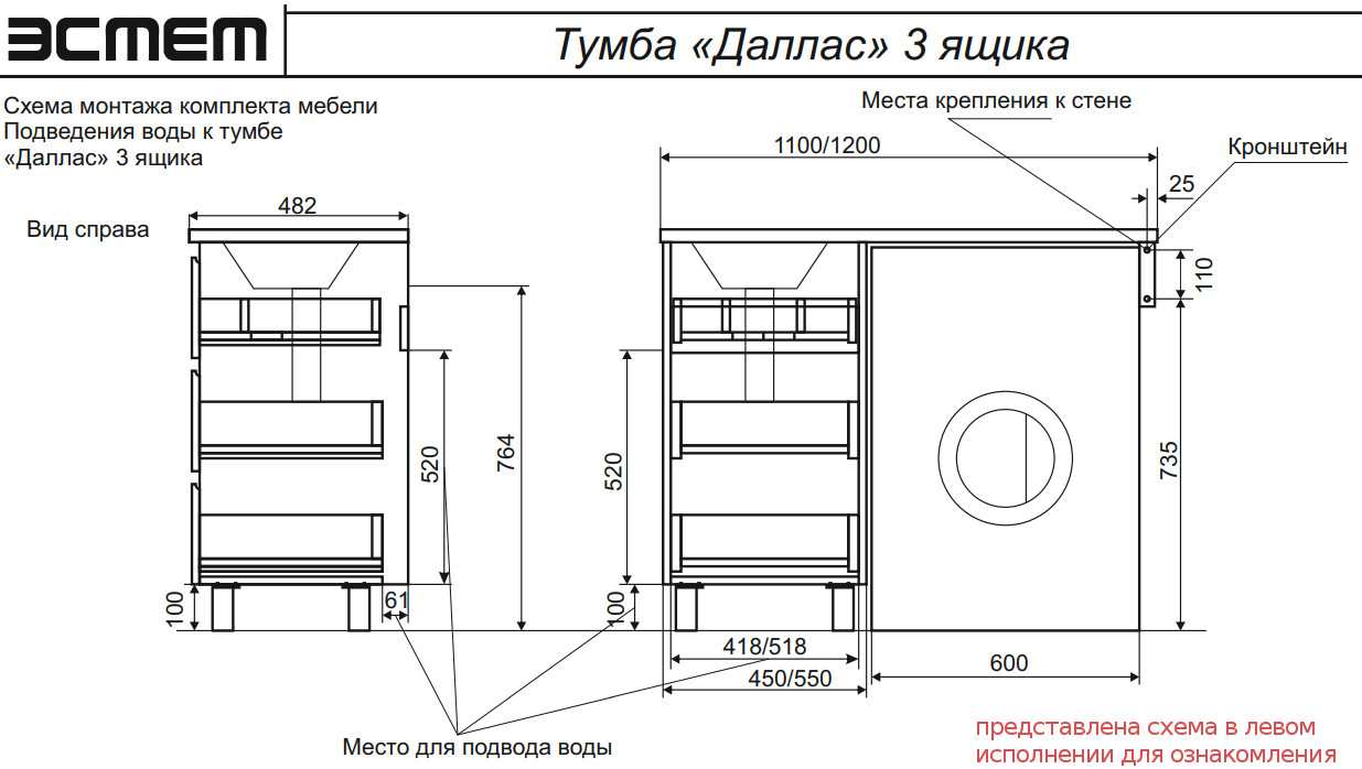 - Тумба с раковиной Dallas Luxe 1150 напольная 3 ящика правая