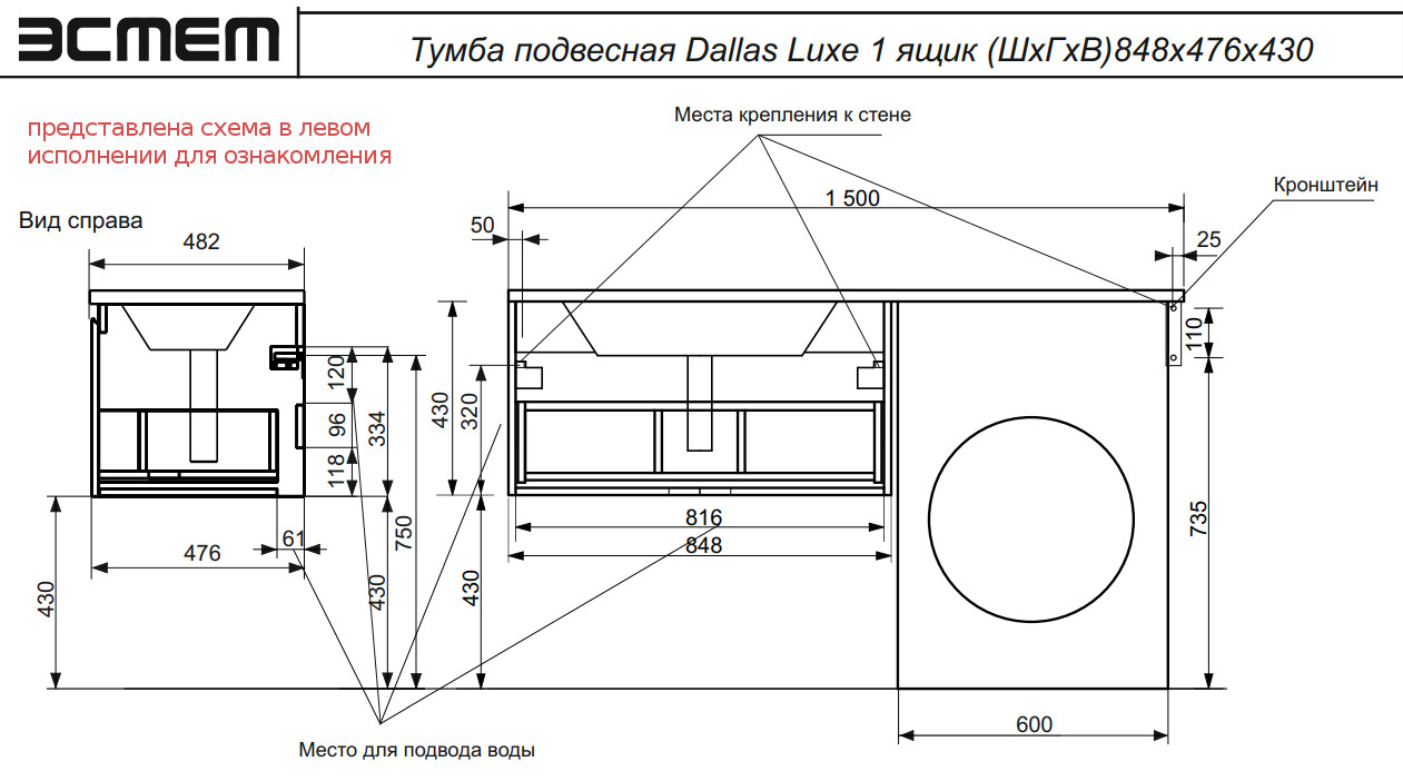 Тумба с раковиной Dallas Luxe 1500 навесная 1 ящик правая