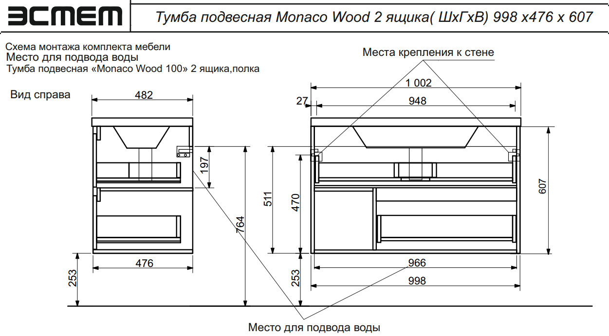 - Тумба с раковиной Monaco Wood 1000 2 ящика с нишей