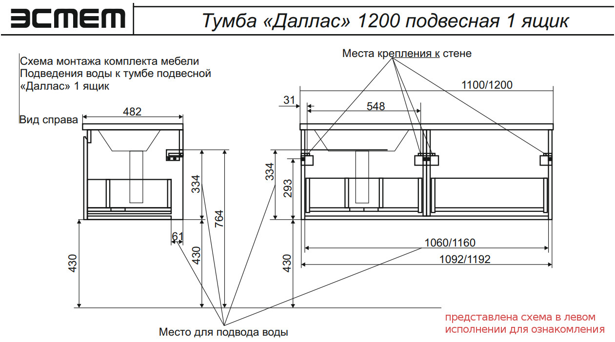 - Тумба с раковиной справа Dallas Luxe 1150 навесная 1 длинный ящик