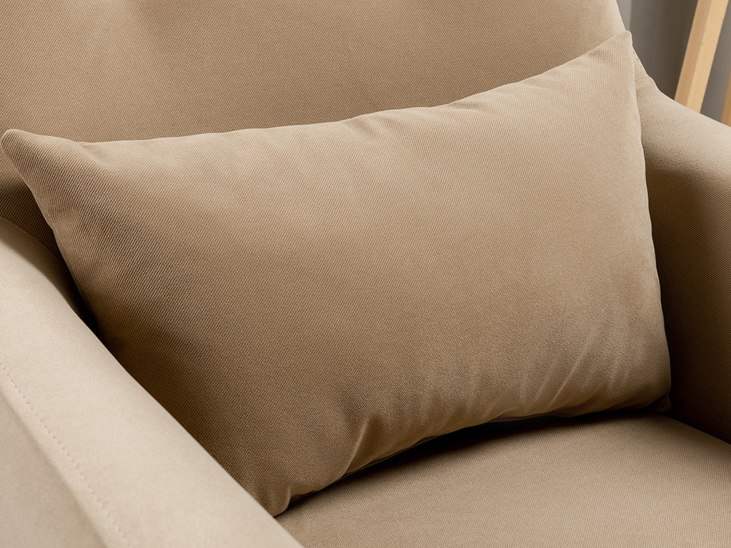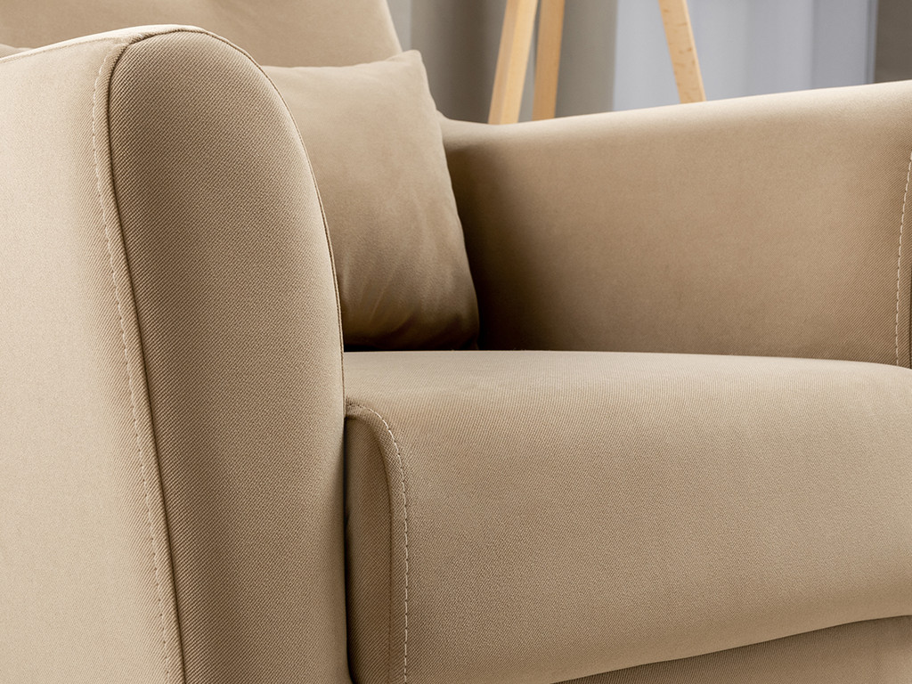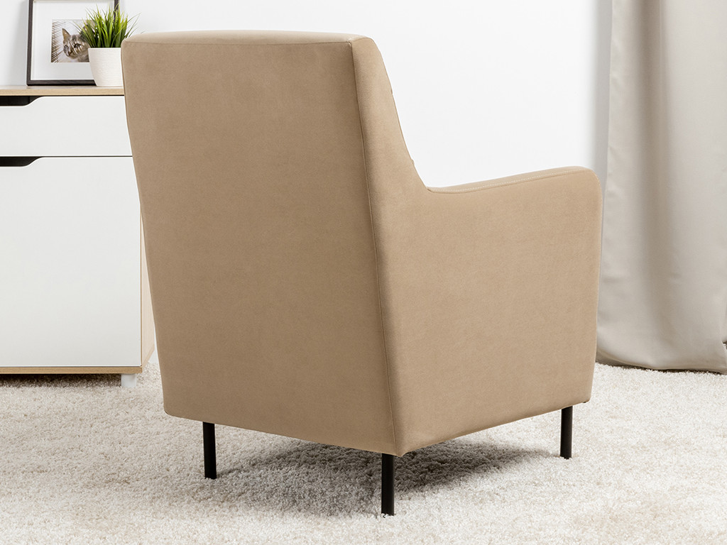 Декоративная утяжка на спинке кресла, декоративная подушка в цвете кресла, металлические опоры переходят в декоративный элемент подлокотника