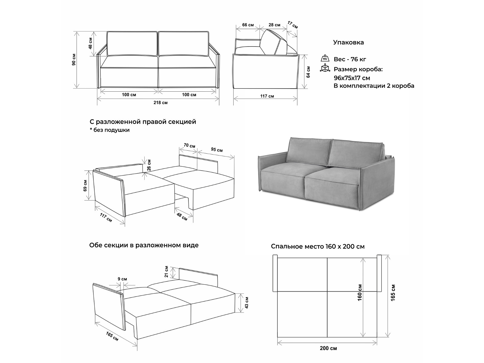 - Спальное место: 1600х2000 мм