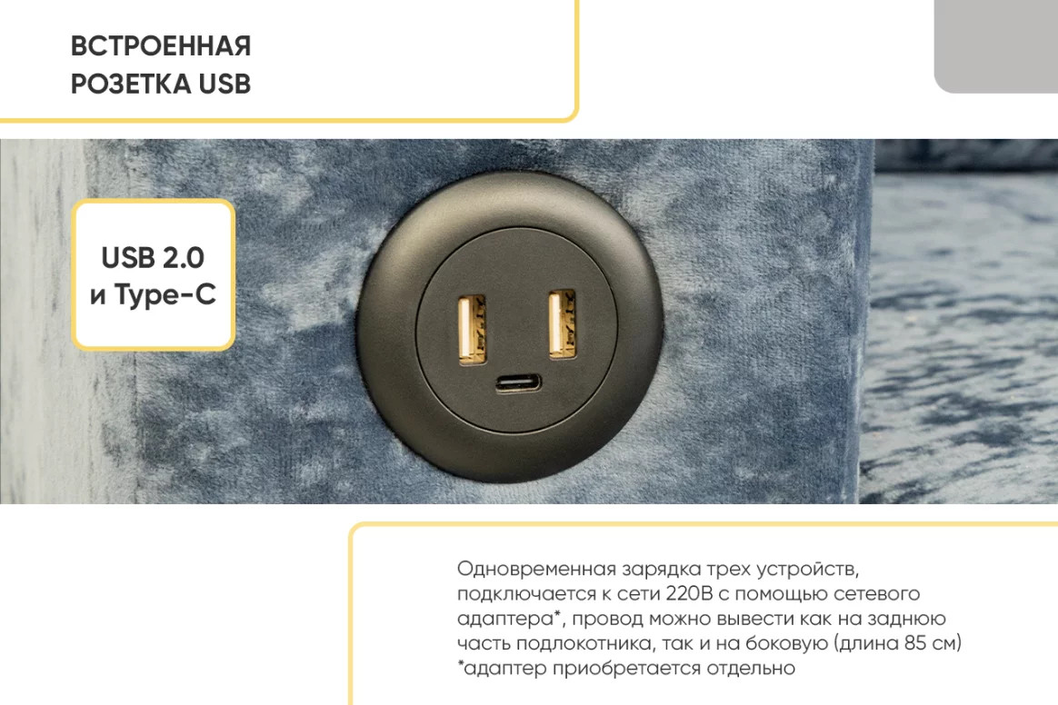 Длина провода от дивана - 85 см. USB2.0. и type-c.