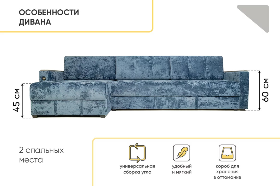 - Диван eгловой Тургояк c USB розеткой Темно-синий Ocean 978