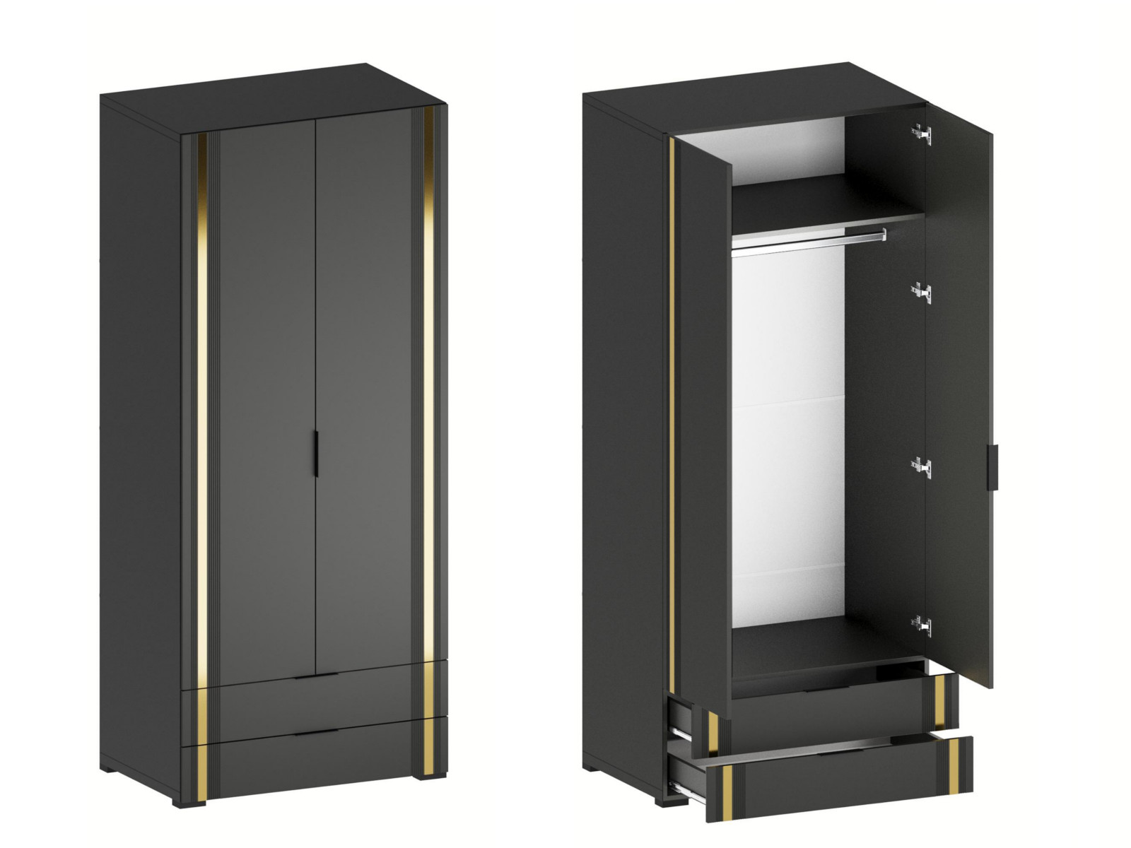 - Фасады из МДФ с оригинальной фрезеровкой покрыты суперматовой пленкой с эффектом Soft Touch в цветах Графит и Milk.