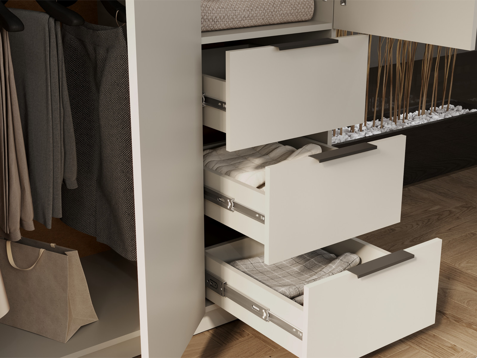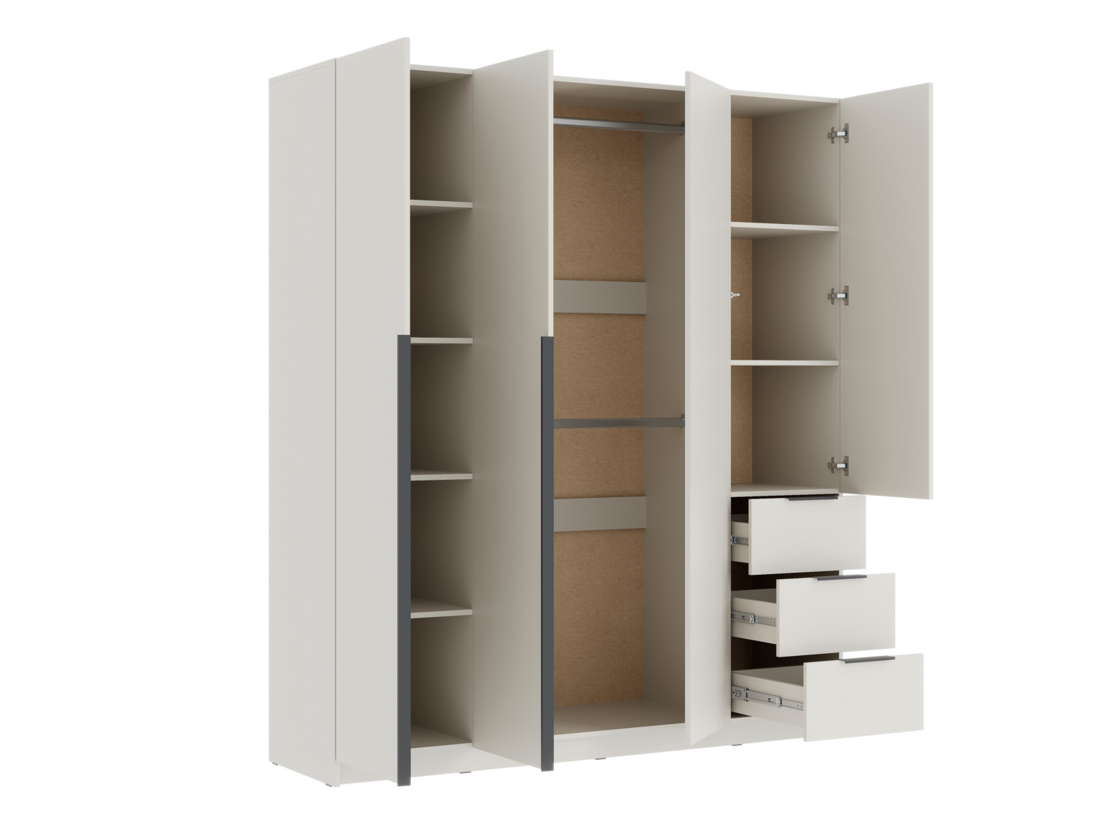 - Две левых створки и фасады ящиков имеют ручку – цвет чёрный, материал – пластик.