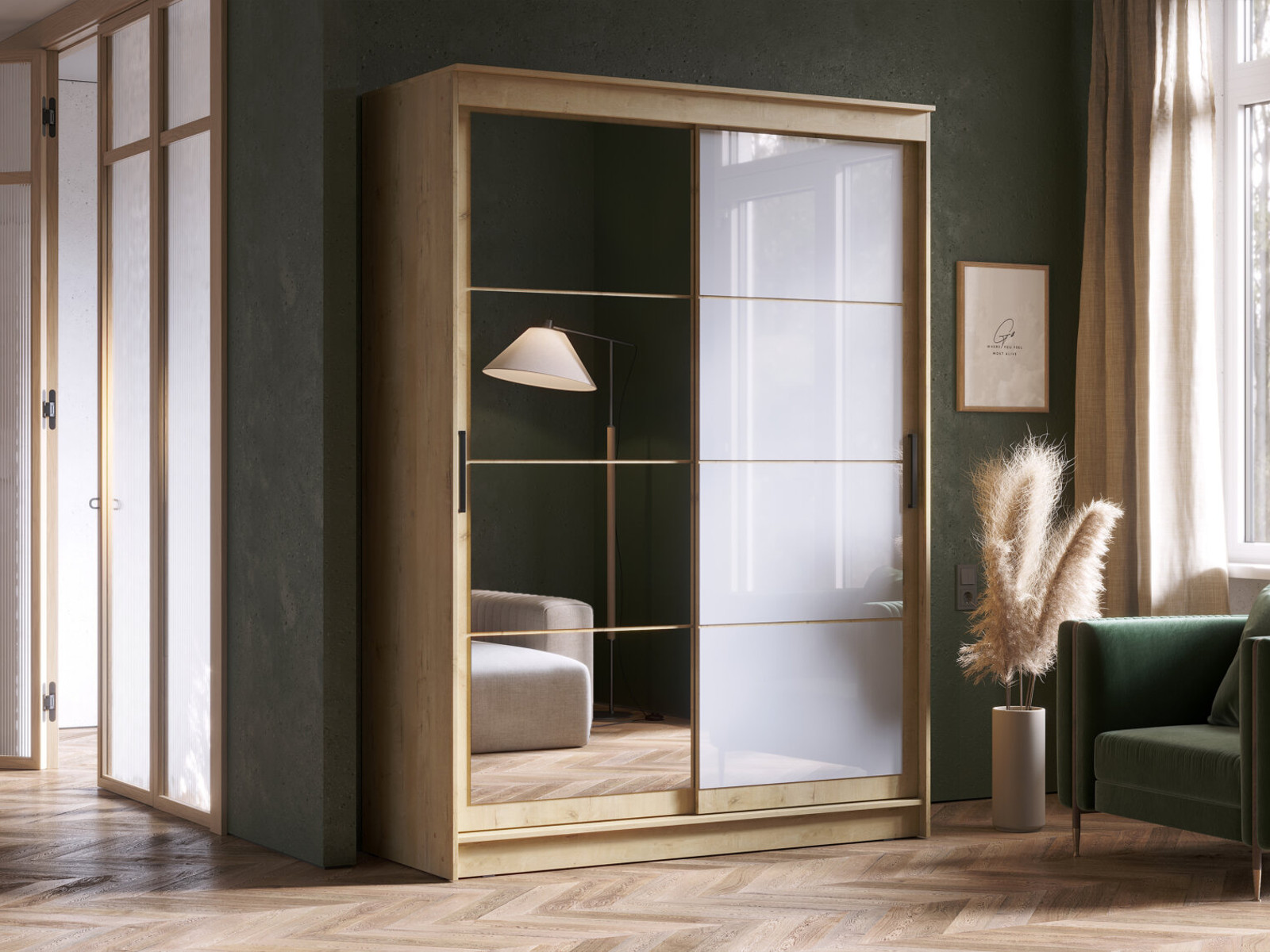 Шкаф-купе Гранд-1 1600 Дуб Вотан-двери Зеркало-Лакобель белый