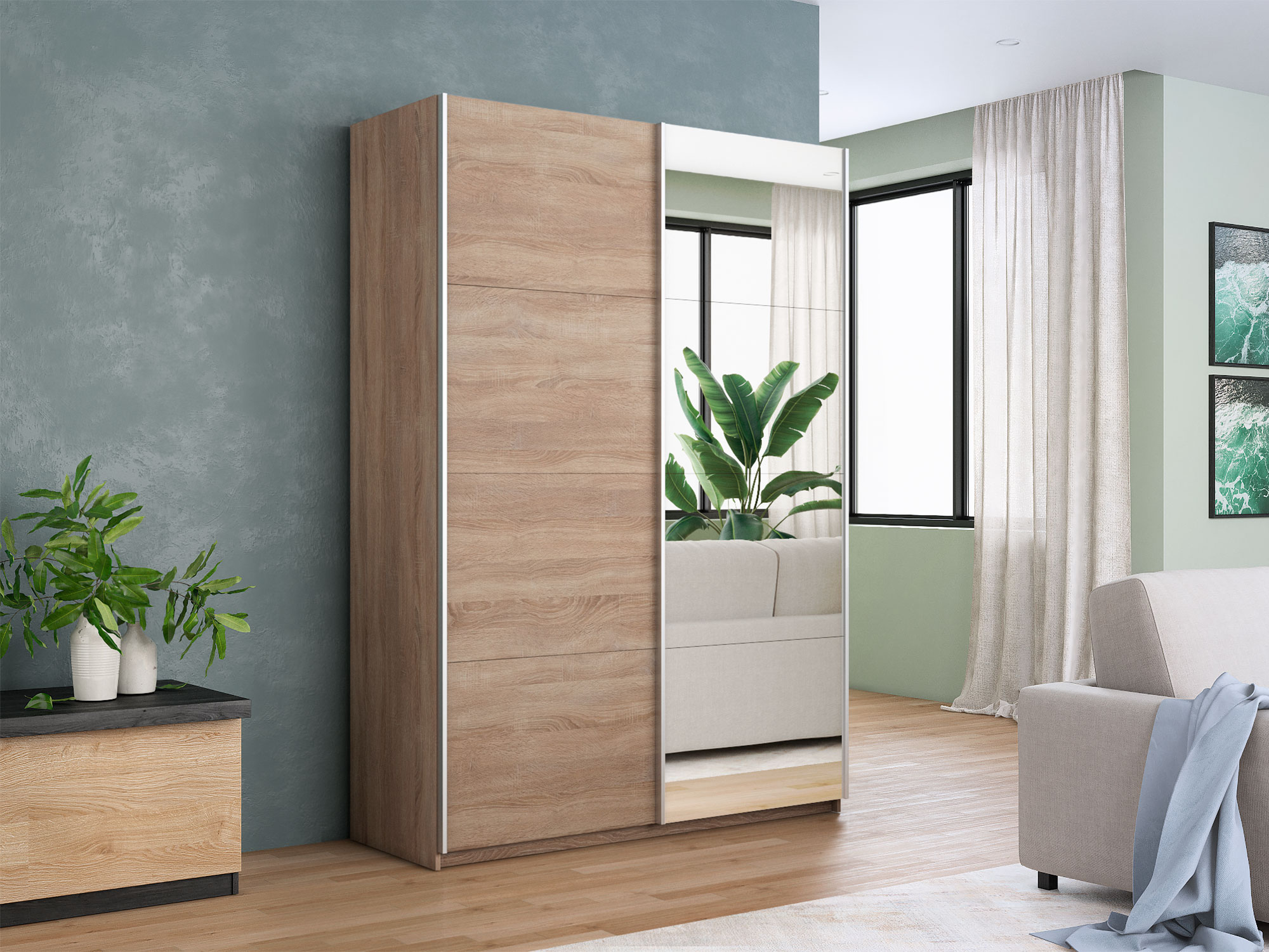 - Шкаф-купе Прайм 2-х дверный 1200 Зеркало/ДСП Сонома