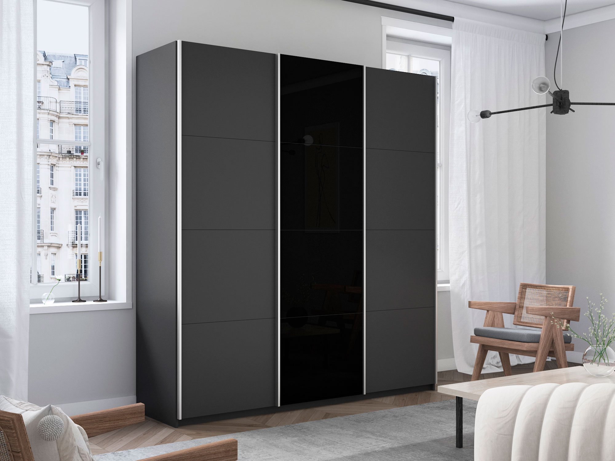 - Шкаф-купе Прайм 3-х дверный 1800 ДСП/Стекло Черное/ДСП Серый Диамант