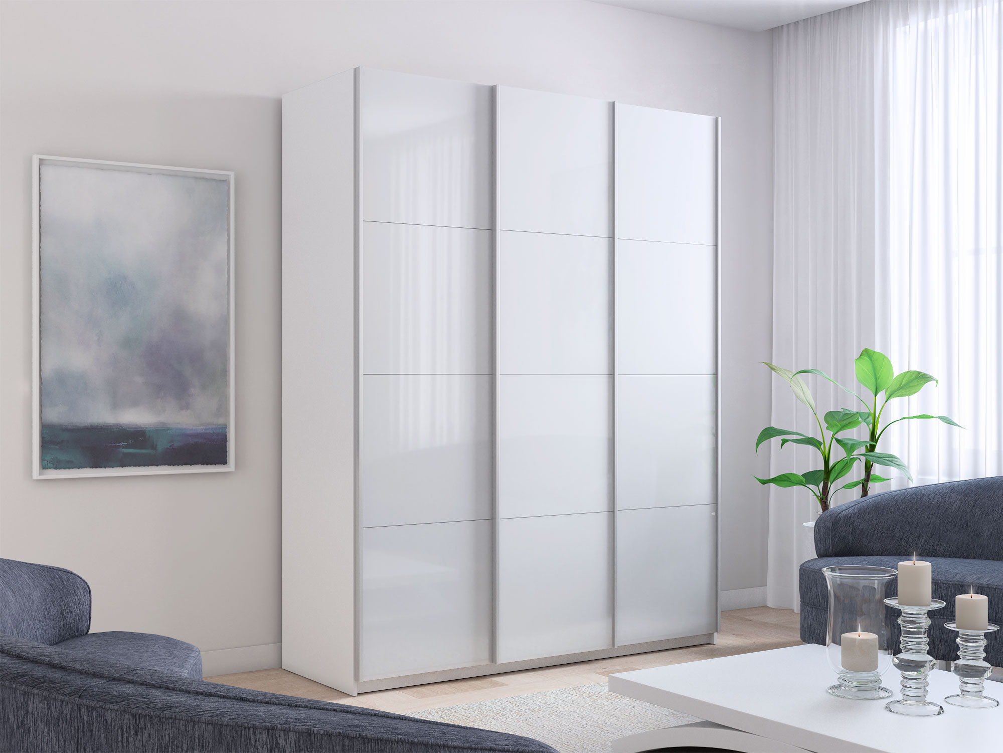 - Шкаф-купе Прайм 3-х дверный 2100 два Стекла Белые/ДСП Белый Снег