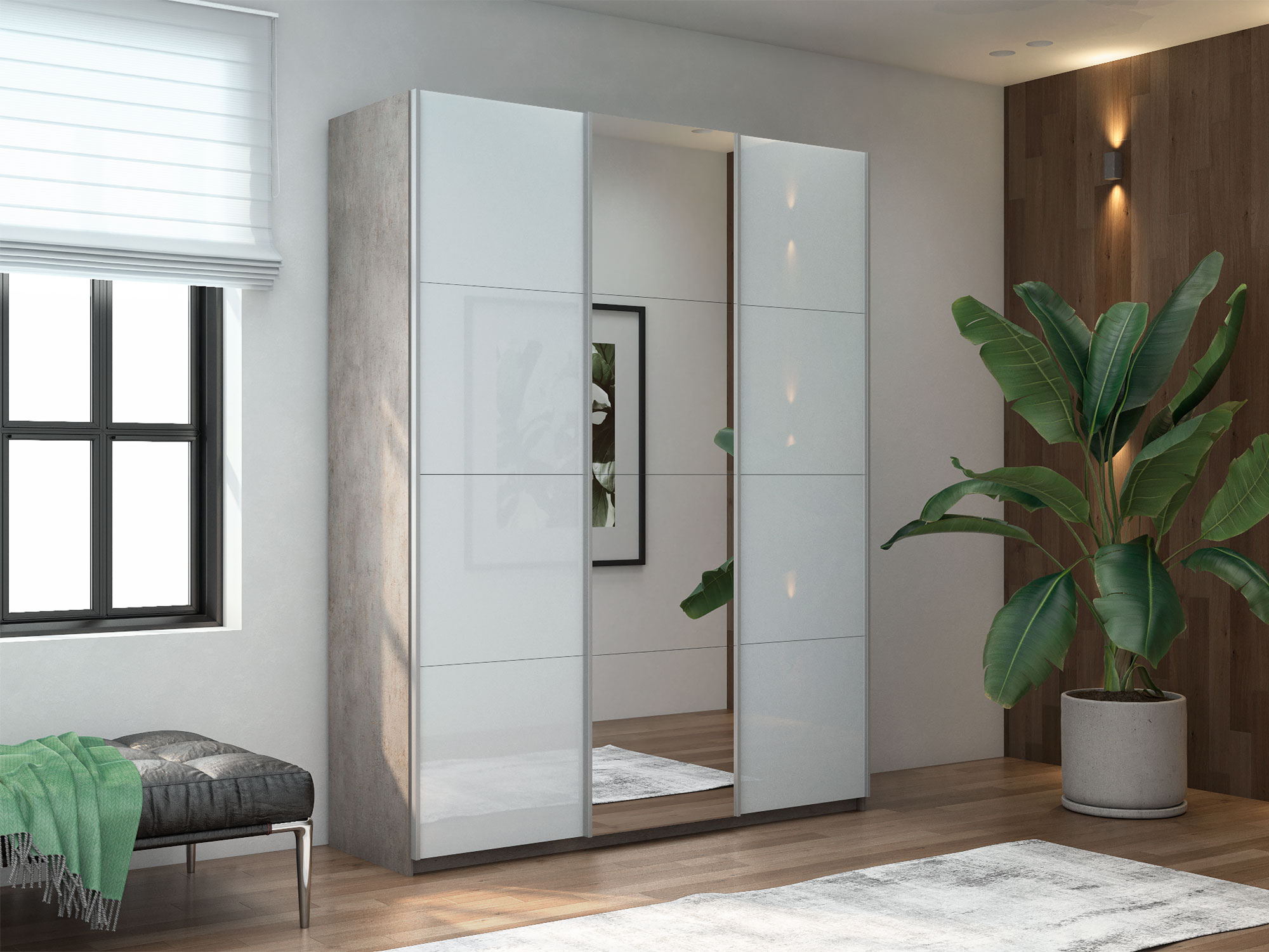 - Шкаф-купе Прайм 3-х дверный 2100 два Стекла Белые/Зеркало Бетон
