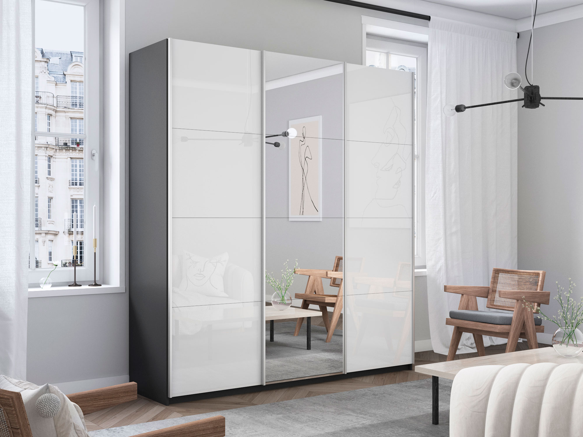 Шкаф-купе Прайм 3-х дверный 2100 два Стекла Белые/Зеркало Серый Диамант