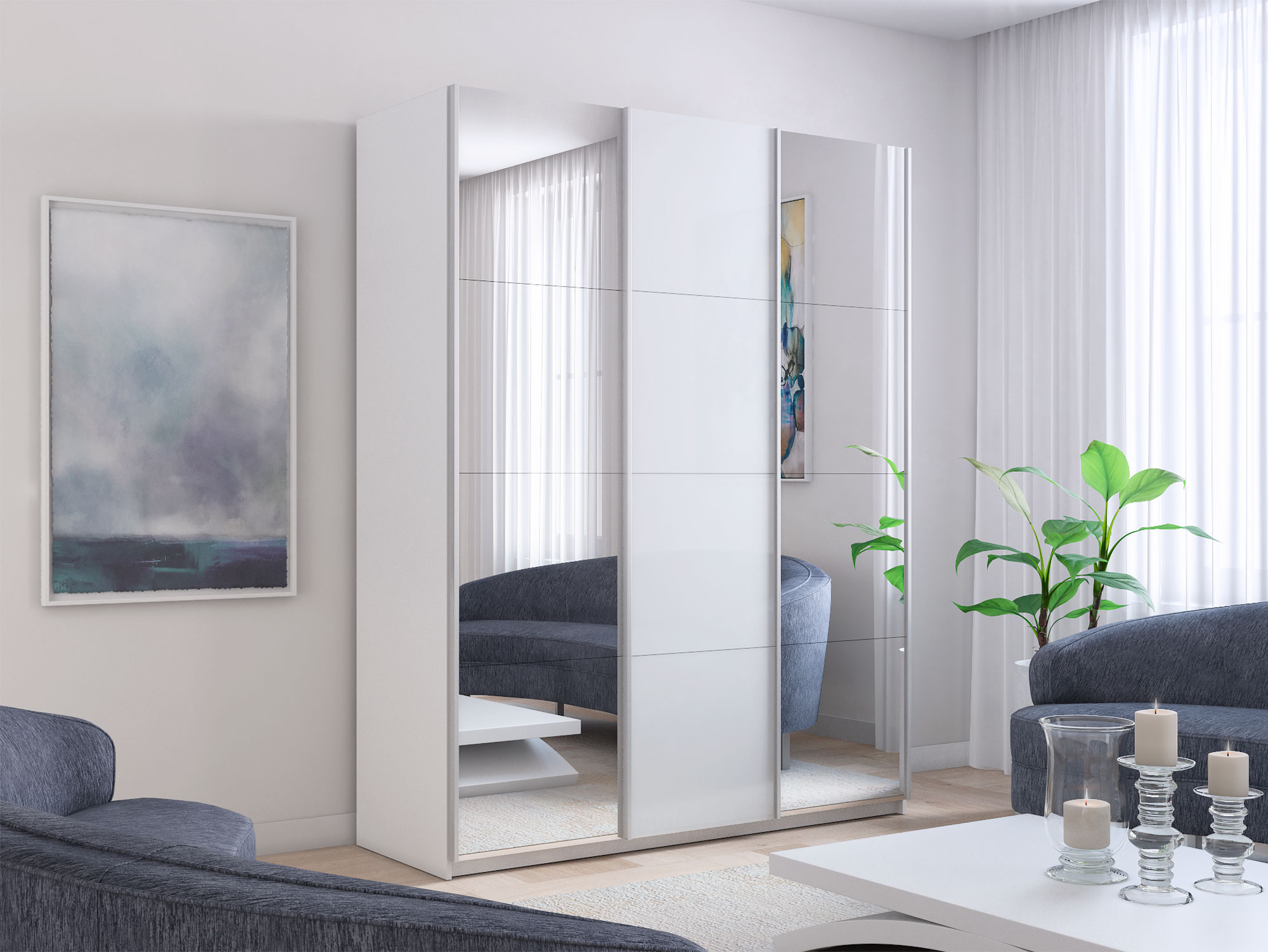 - Шкаф-купе Прайм Широкий 3-х дверный два зеркала/стекло белое Белый Снег